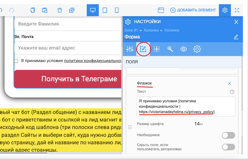 4) В строке о политике конфиденциальности поменяй адрес (если есть в списке страниц сайта) - см. Скриншот 2. Если нет страницы с политикой. Просто удали старый адрес)
